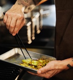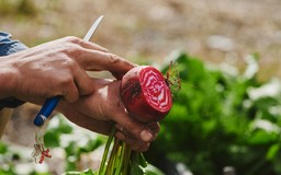 Before we head to the kitchen, there’s one final stop: Meacham Urban Farm, in the heart of Tampa. As we close in, I flick the CX‑50 Hybrid into EV mode, traversing the city streets quietly and confidently. Meacham Urban Farm uses urban regenerative agriculture as a way to both feed and educate the community of Tampa Bay, producing over 30 varieties of organic fruits and vegetables in the heart of the city. It’s here that Joe Dalessio, with his team, transformed an empty two-acre lot, once peppered with scrub trees and little else, into a thriving oasis of regenerative farming. “To me, food is culture,” says Joe. “It’s the foundation of what culture is. I love growing good food and doing that for my community.” He picks the perfect Chioggia beets for our recipe and helps us pack away our final set of ingredients into the CX‑50, before we head back to the kitchen. The beets, Ferrell explains, will be paired with whipped ricotta cheese, pickled gooseberries, and edible flowers. I rifle through our ingredients, while Ferrell sharpens his set of Japanese knives. Behind him, machines click and whirr into life.